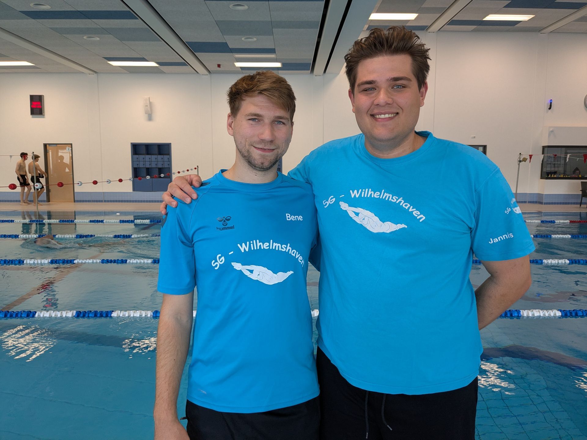 WILHELMSHAVEN/KIE Am vergangenen Freitag fand im Schortenser „Aqua-Fit“ die 28. Auflage der friesischen Nacht für Masters-Schwimmers statt. 47 Teilnehmer aus elf verschiedenen Vereinen folgten der Einladung vom ausrichtenden Heidmühler FC. Insgesamt waren nach Meldeergebnis 148 Einzel-und Staffelrennen auf fünf Bahnen mit Wellenkillerleinen geplant. Von der SG Wilhelmshaven nahmen lediglich Jannis Neumann (Jg.2000/AK25) und Benedikt Weschenfelder (Jg.2001/AK20) teil. Neumann startete zweimal, in den Rennen über 50m Schmetterling und 100m Lagen wurde er jeweils Erster. Dadurch konnte er sich für das Finale der acht Zeitbesten über 25m Schmetterling qualifizieren und belegte hier am Ende den undankbaren vierten Platz. Weschenfelder startete über 50m Freistil und Brust sowie 100m Lagen. Hier sprangen eine Gold-und zwei Silberplätze heraus. Auch er konnte sich für einen Finallauf qualifizieren, auf der 25m Freistilstrecke schlug er als Dritter an. „Insgesamt konnten wir unsere Meldezeiten halten, sodass wir zufrieden mit unserem Abschneiden sind. Die Stimmung im Bad war sehr locker und entspannt was bei uns „ehrgeizigen“ Masters nicht immer der Fall ist,“ resümierte Weschenfelder augenzwinkernd. Als Kampfrichter war Sonja Schober für die SG im Einsatz.