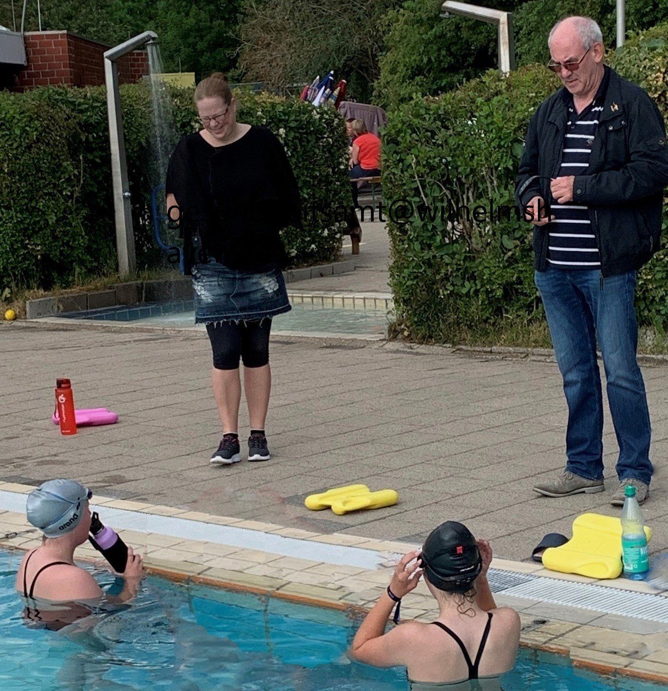 Gleich am 2. Trainingstag in dieser Freibadsaison konnten einige Aktive das Training mit Headset- Unterstützung ausprobieren. Jürgen Voigt war extra zu einer Einweisung aus Essen angereist. Die Trainerin Yvonne Dankert war sofort begeistert von den neuen Möglichkeiten. Für die Schwimmer war es ungewohnt ihre Trainerin mitten auf der Strecke zu hören, als wenn sie neben ihnen stehen würde. Am Ende des Einweisungstrainings waren alle begeistert. Nun warten alle gespannt auf die Lieferung der Geräte, die im Ursprung für das Synchronschwimmtraining entwickelt wurde und nun immer öfter von den Beckenschwimmern für sich entdeckt werden. Für uns heißt es: "nach vorne schauen, auch unter erschwerten Corona-Trainingsbedingungen und nicht mit Wehmut zurück" erzählt die Schwimmwartin der SG Wilhelmshaven Stefanie Gründler. Sie ist überzeugt davon, mit der neuen Trainingsmöglichkeit einen Schritt in die richtige Richtung zu gehen.